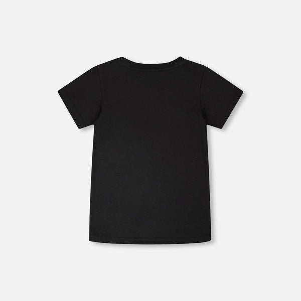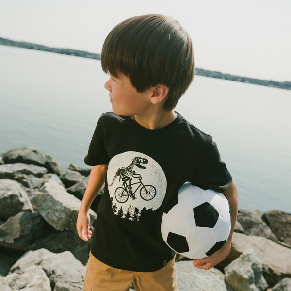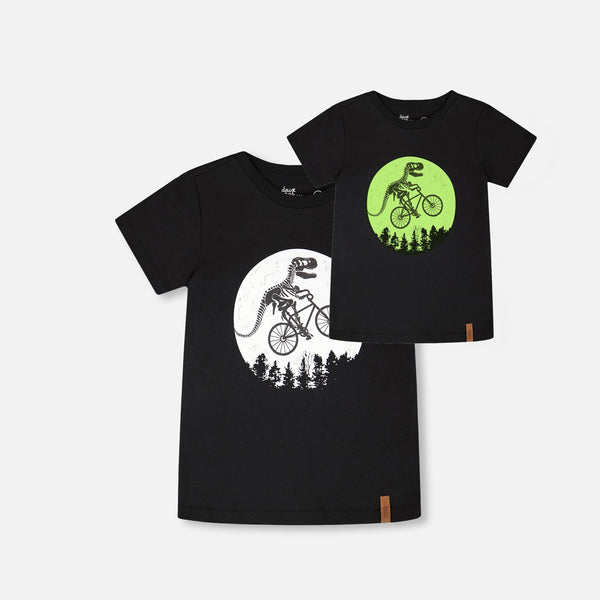 Pedal into adventure with this organic cotton jersey tee! Featuring a bold black and white graphic of a dino skeleton cruising on a bike—inspired by that iconic E.T. moment—this short-sleeve essential brings retro cool and playful vibes to any kid's wardrobe. Soft, breathable, and ready for everyday fun.