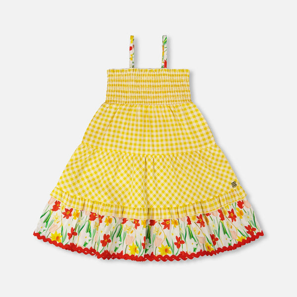 Bright and playful, this sundress is designed for sunny days and carefree adventures. The sleeveless silhouette features charming smocked details on the bodice, while the flowing skirt showcases a cheerful daffodil print. Crafted from a lightweight cotton blend, it's breathable and comfortable for all your summer outings—the perfect companion for warm-weather fun.